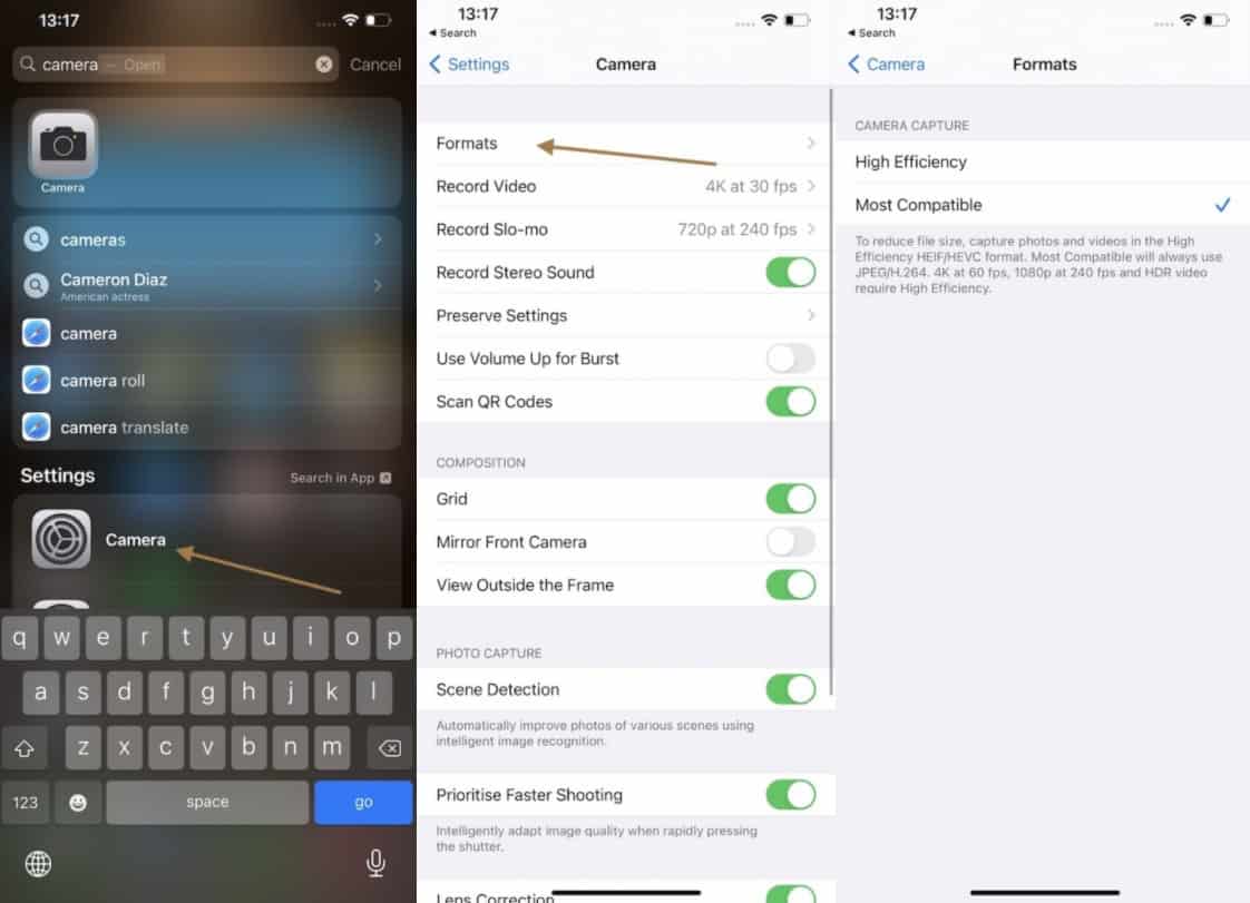 Bạn có thể vào Cài đặt, sau đó là Máy ảnh, vào Định dạng và chọn Định dạng tương thích nhất thay vì Định dạng hiệu quả nhất. Các định dạng tương thích này chiếm nhiều dung lượng hơn một chút, nhưng ít nhất bạn có thể dễ dàng chia sẻ chúng với các thiết bị khác nhau.