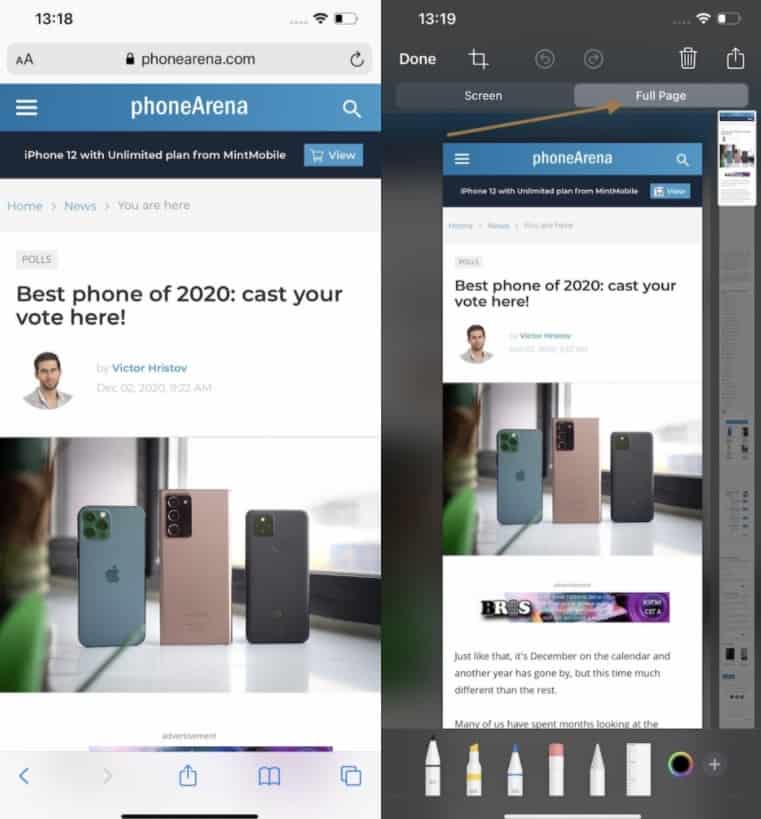 Trước hết, trên iOS, tùy chọn này chỉ khả dụng trong Safari, nghĩa là bạn không thể sử dụng nó trong các trình duyệt web khác như Chrome chẳng hạn. Chỉ cần chụp ảnh màn hình trong Safari, nhấn vào hình thu nhỏ ảnh chụp màn hình và sau đó nhấn “Toàn trang”. Bây giờ bạn có thể cắt ra phần mà mình muốn. Bạn cũng có thể vẽ, thêm mũi tên để hiển thị một phần cụ thể hoặc kính lúp. Nhấn xong và bạn có thể lưu tài liệu này dưới dạng tài liệu PDF trong ứng dụng Tệp.
