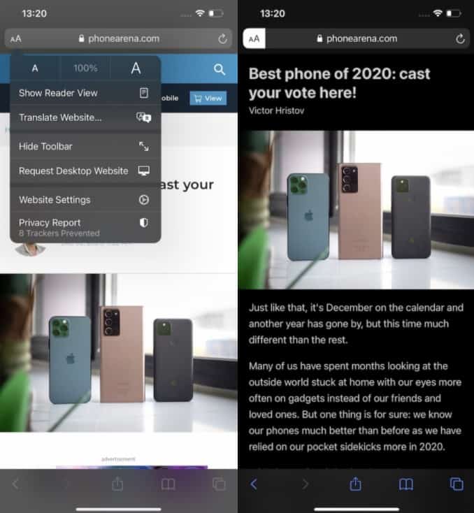 Bạn thường sử dụng Chế độ tối vào ban đêm, tuy nhiên chế độ tối không biến nền của các trang web trong Safari trở nên tối. Đây là một mẹo nhỏ, khi Chế độ tối được bật, bạn có thể nhập một bài báo cụ thể và nhấn vào nút chế độ đọc ở trên cùng bên trái, thao tác này sẽ chuyển nền thành màu đen và dễ nhìn hơn nhiều vào ban đêm.