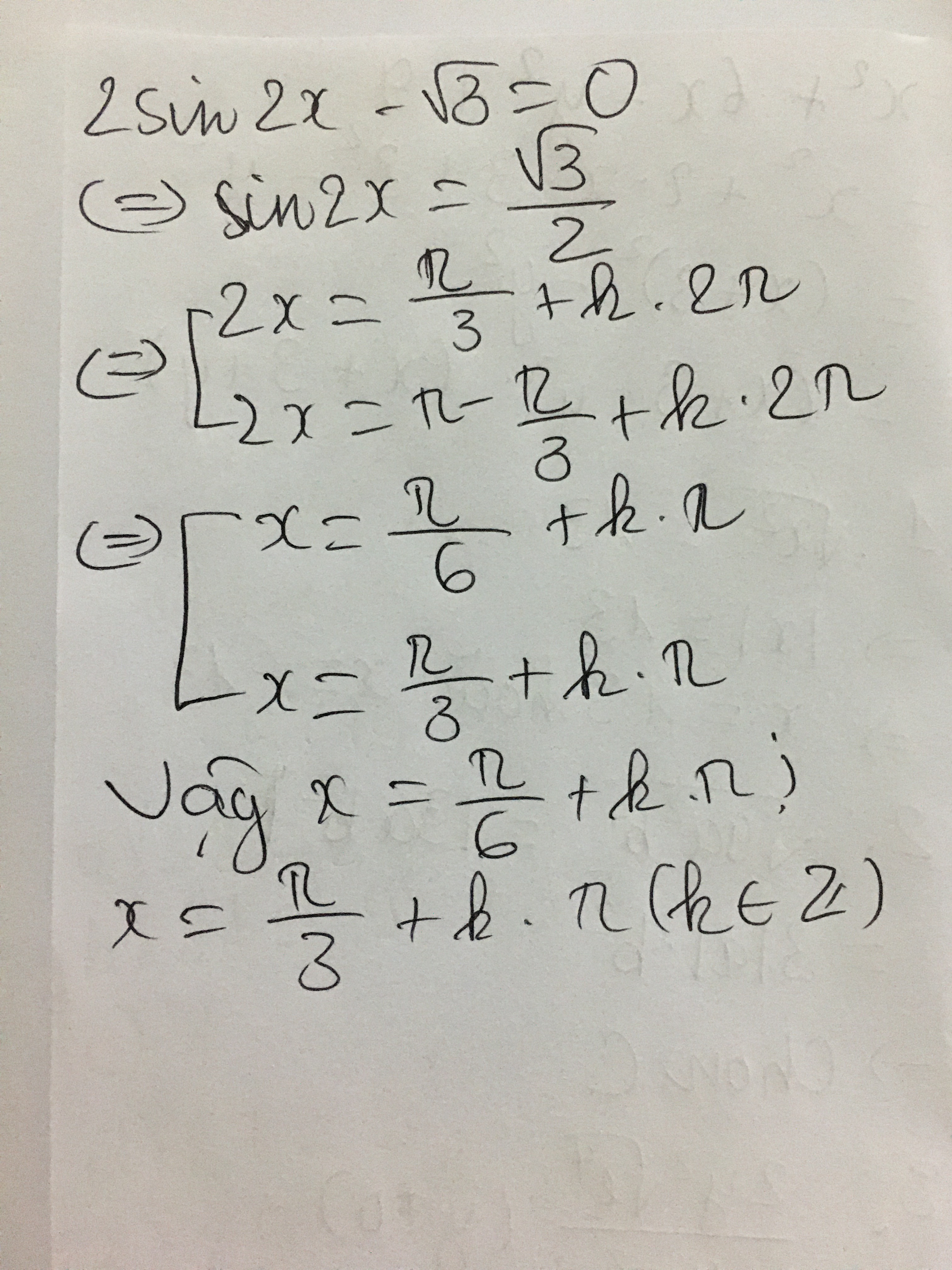 H Hằng 4 năm trước\[\begin{array}{l}2sin2x - \sqrt 3 = 0\\\Leftrightarrow \sin 2x = \frac{{\sqrt 3 }}{2}\\\Leftrightarrow \sin 2x = \sin \frac{\pi }{3}\\\Leftrightarrow \left[ \begin{array}{l}2x = \frac{\pi }{3} + k2\pi \\2x = \pi - \frac{\pi }{3} + k2\pi \end{array} \right.\\\Leftrightarrow \left[ \begin{array}{l}x = \frac{\pi }{6} + k\pi \\x = \frac{\pi }{3} + k\pi \end{array} \right.\left( {k \in Z} \right)\\vay:S = \{ \frac{\pi }{6} + k\pi ;\frac{\pi }{3} + k\pi \} \end{array}\]