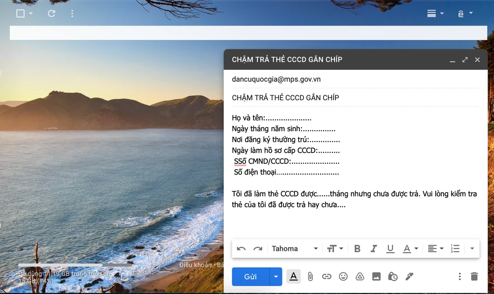 Khi gửi mail người dân cũng cần cung cấp một số thông tin như: Họ và tên; ngày tháng năm sinh; nơi đăng ký thường trú; ngày làm hồ sơ cấp CCCD; số CMND/CCCD; số điện thoại…Kèm theo đó chủ đề của thư gửi đi có thể ghi là “CHẬM TRẢ THẺ CCCD GẮN CHÍP” để dễ dàng cho bộ phận tiếp nhận xử lý thông tin.