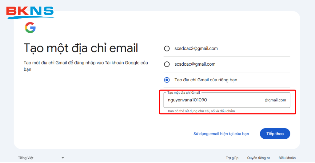 Bước 8: Điền email muốn lập vào mục Tạo một địa chỉ Gmail khác