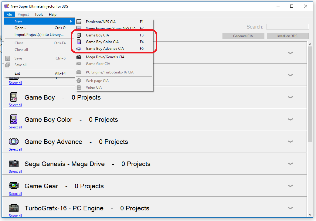 - Tải phần mềm New Super Ultimate Injector for 3DS về máy tính và mở ra: download tại đây - Chọn New - chọn hệ game bạn muốn chuyển về CIA, sau đó làm theo các hướng dẫn trong hình.