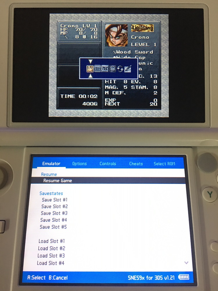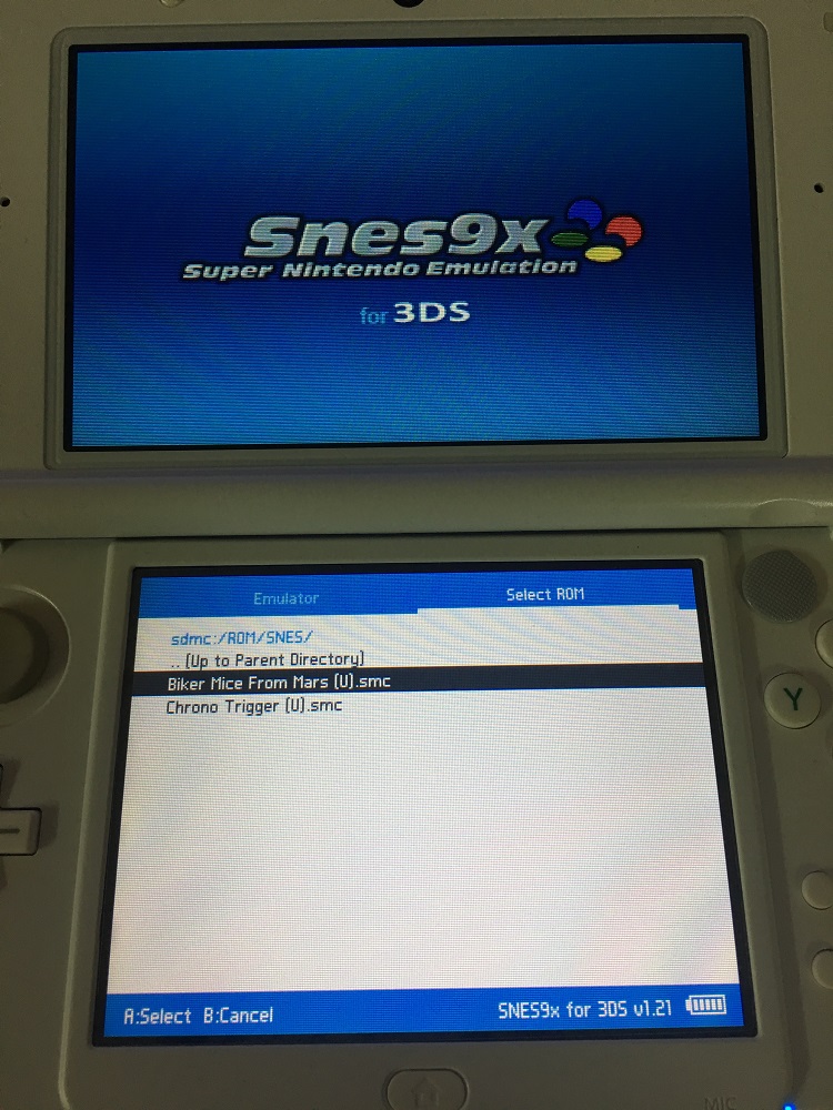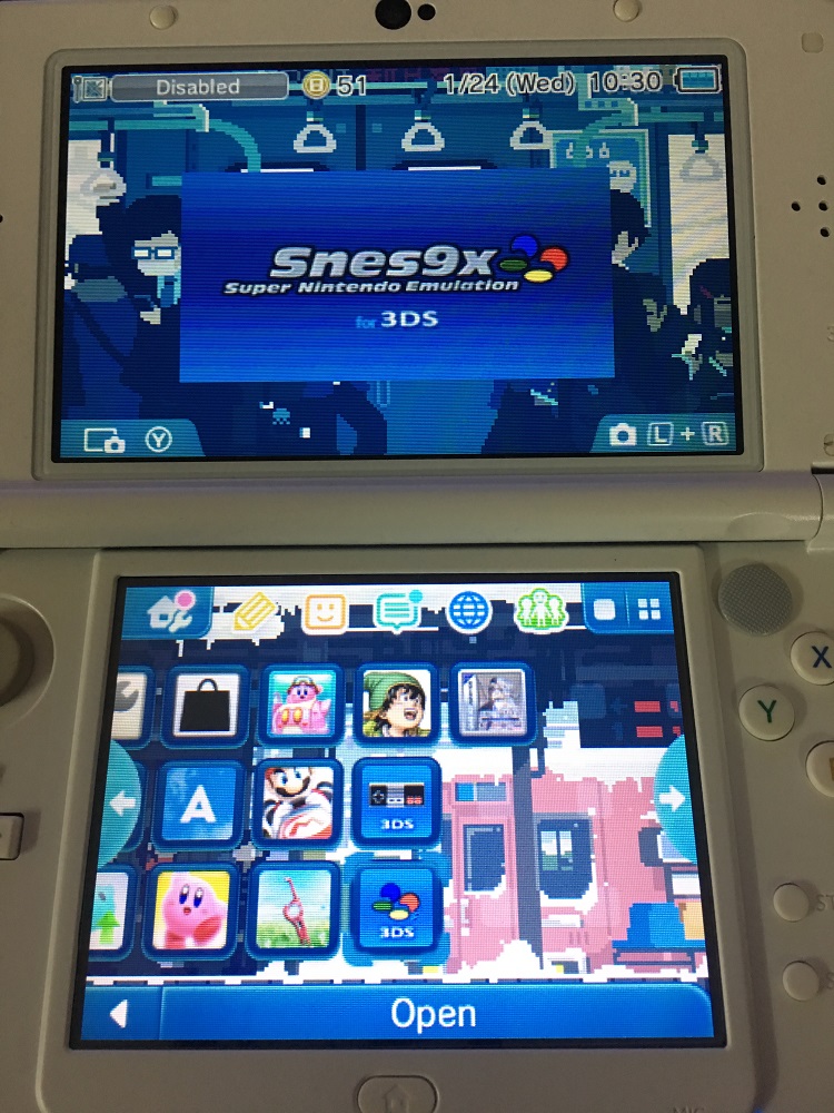 SNES (SUPER Nintendo Entertainment System), hệ máy trước đây được gắn bộ phụ trợ chơi game chép SuperUFO và phổ biến với tên gọi "Điện tử đĩa mềm" tại Việt Nam. Giờ đây với giả lập Snes9x, mọi người có thể chơi bất kì game SNES nào trên máy 2DS/3DS của mình. Điểm đặc biệt của dòng 2DS/3DS đó là có độ phân giải tương tự tivi cổ hồi xưa (320x240) nên trải nghiệm SNES trên 2DS/3DS với chế độ pixel perfect sẽ cho bạn hình ảnh giống hệt như chơi trên tivi, không bị co giãn hay bóp méo.