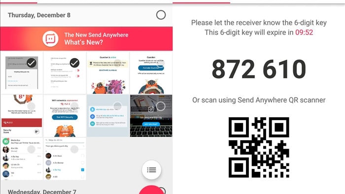 Khi hoàn tất, bạn bấm vào biểu tượng mũi tên màu đỏ ở góc phải bên dưới. Lúc này, ứng dụng sẽ tạo ra sáu con số ngẫu nhiên (hoặc QR Code), việc bạn cần làm là mở ứng dụng Send Anywhere trên thiết bị nhận, chuyển sang phần Receive (nhận) và nhập vào sáu con số tương ứng.