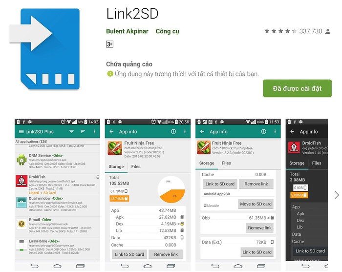 Ngoài những cách kể trên, bạn có thể cài đặt thêm các ứng dụng của bên thứ ba để thực hiện việc này nhanh hơn. Đơn cử như Apps2SD, FolderMount (yêu cầu thiết bị đã root) hoặc Link2SD (có hai phiên bản dành cho máy đã root và chưa root).