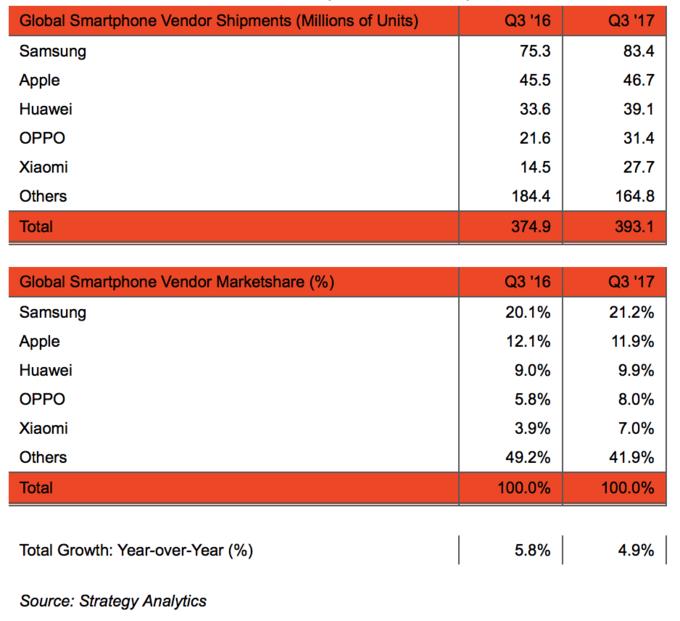 Thống kê 5 nhà sản xuất smartphone lớn nhất thế giới dựa trên số liệu báo cáo từ hãng nghiên cứu thị trường Strategy Analytics cung cấp trong quý III/2017.