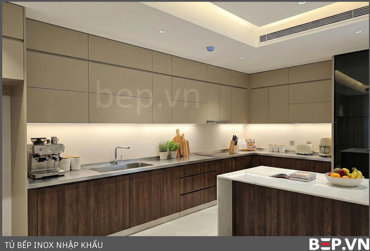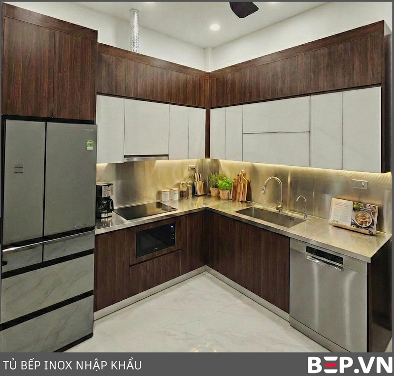 - Thẩm mỹ sang trọng: Tủ bếp inox (đặc biệt kết hợp cánh kính, cánh Acrylic, cánh gỗ cao cấp) mang lại vẻ đẹp hiện đại, đẳng cấp, phù hợp với không gian rộng lớn của biệt thự, nhà đất.