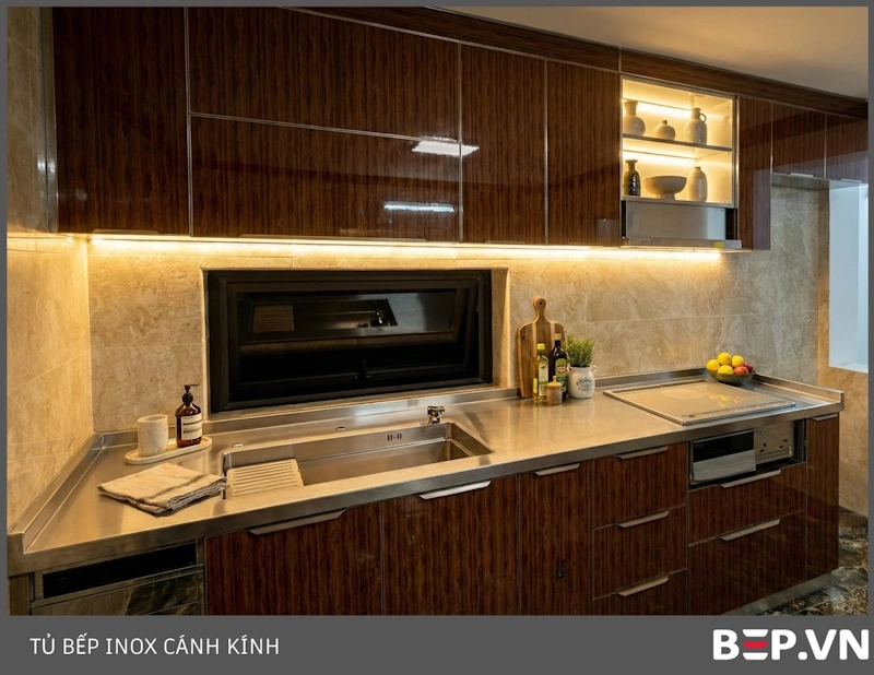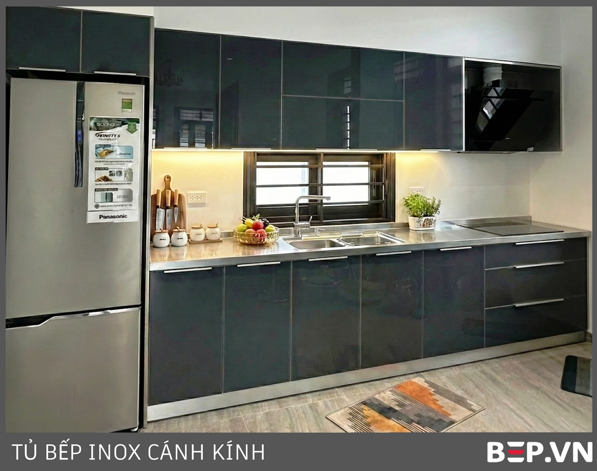 Tủ Bếp Inox Cánh Kính Cường Lực: Sự lựa chọn hoàn hảo cho những ai yêu thích sự sang trọng, hiện đại và dễ vệ sinh. Bep.vn cung cấp 2 dòng: cánh kính khung nhôm (giá hợp lý) và cánh kính khung inox nhập khẩu (thiết kế sang trọng, độ bền vượt trội).
