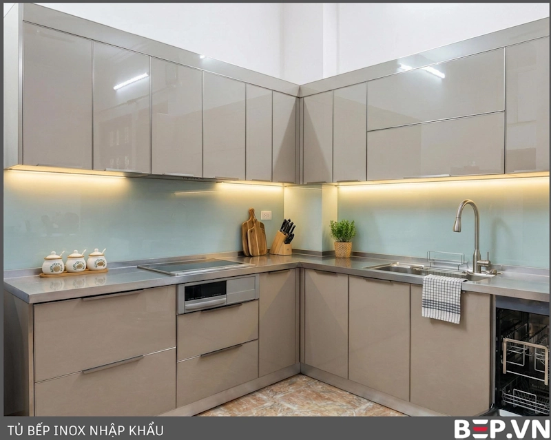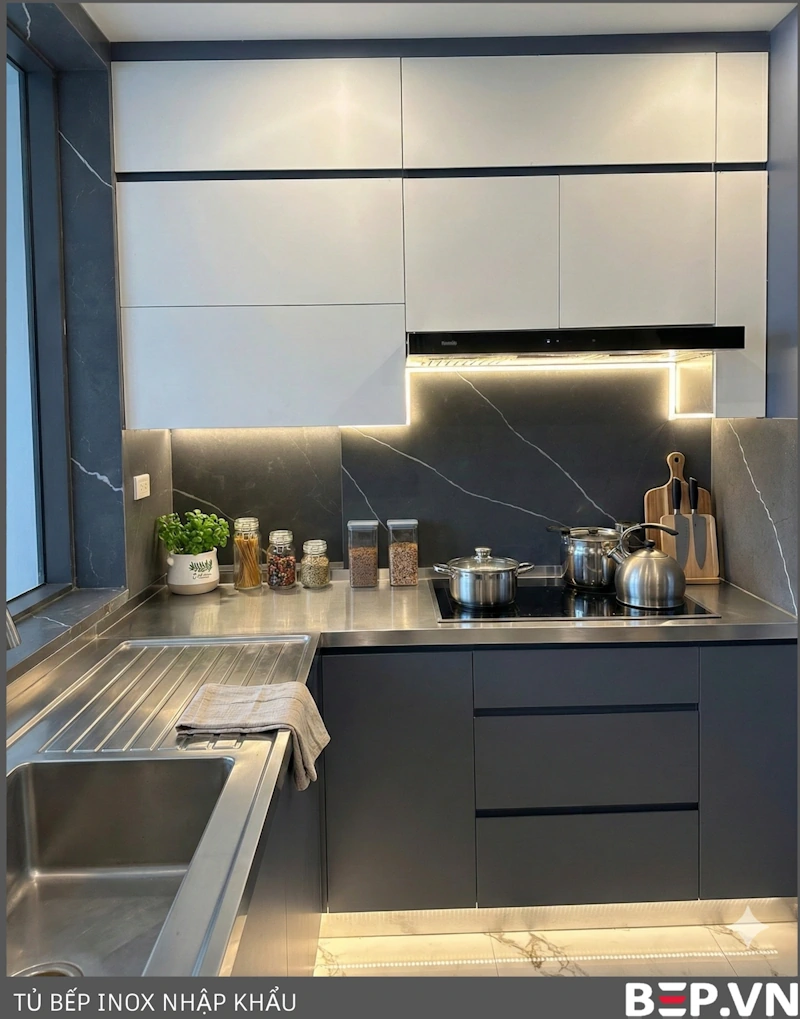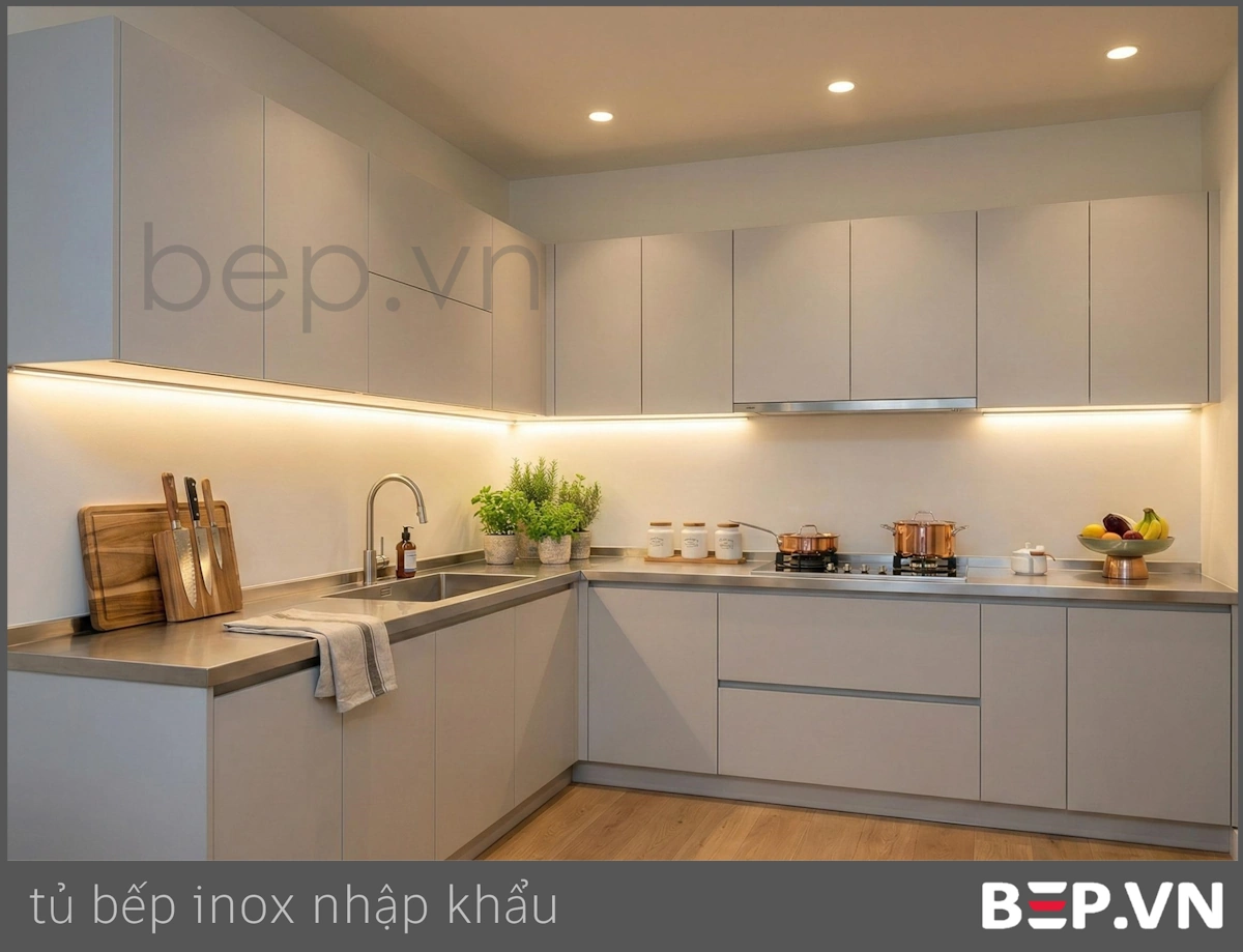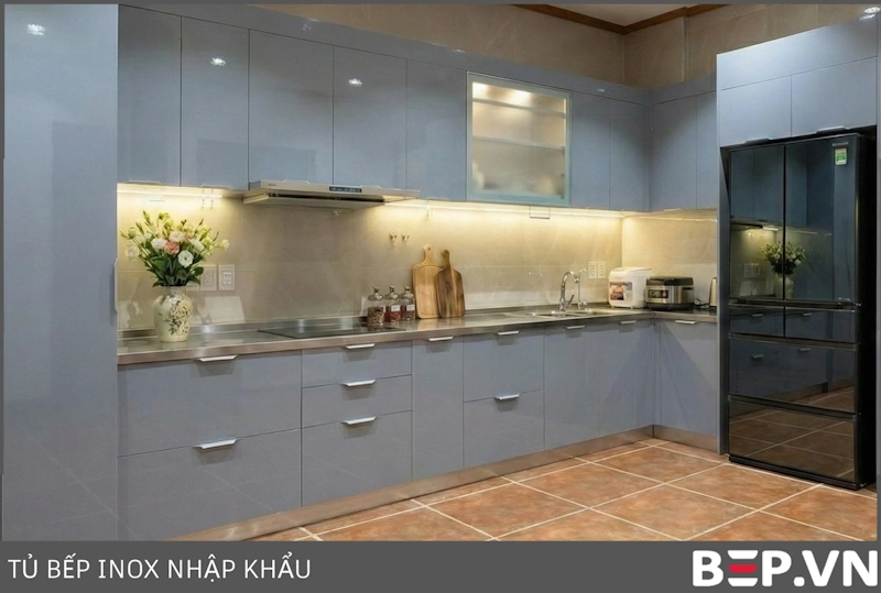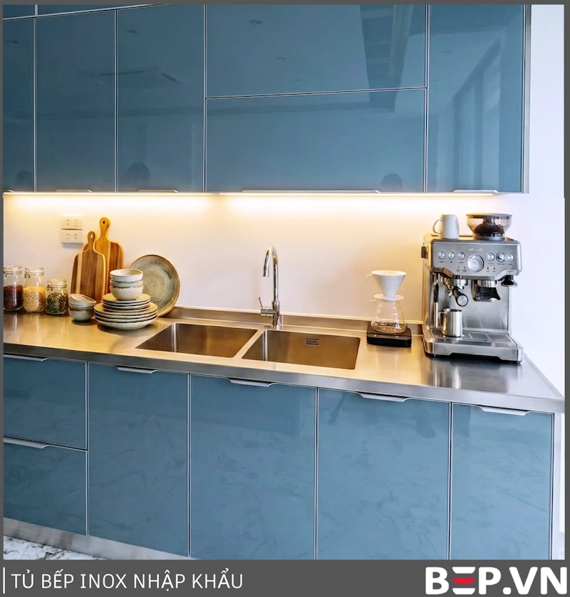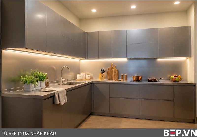 Tủ bếp inox cánh inox đơn sắc: Mang đến vẻ đẹp hiện đại, mạnh mẽ và tinh tế. Cánh tủ nhập khẩu, cấu tạo 3 lớp, đảm bảo độ bền và khả năng chống gỉ sét tuyệt đối.