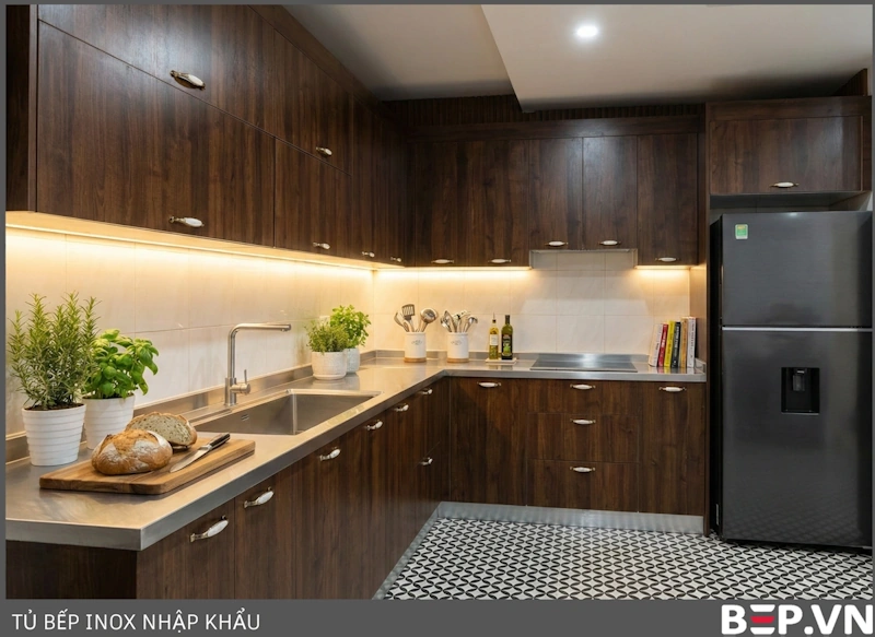 Tủ Bếp Inox Cánh Gỗ Công Nghiệp (Laminate/Melamine): Lựa chọn kinh tế, đa dạng mẫu mã vân gỗ, phù hợp với nhiều phong cách thiết kế. Bep.vn sử dụng cốt gỗ công nghiệp chống ẩm chất lượng cao.