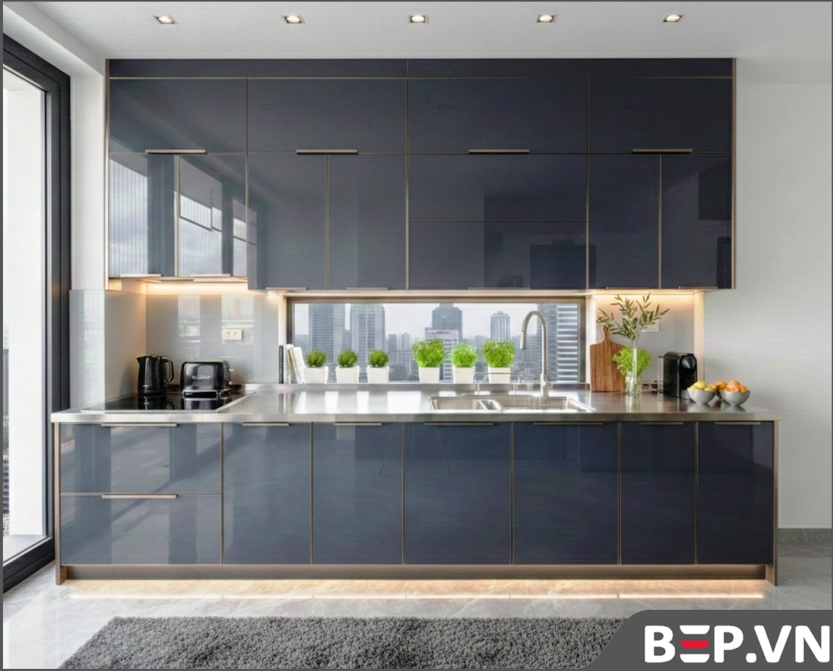 Tủ bếp Acrylic: Bề mặt bóng gương sang trọng, hiện đại, dễ lau chùi, màu sắc đa dạng.