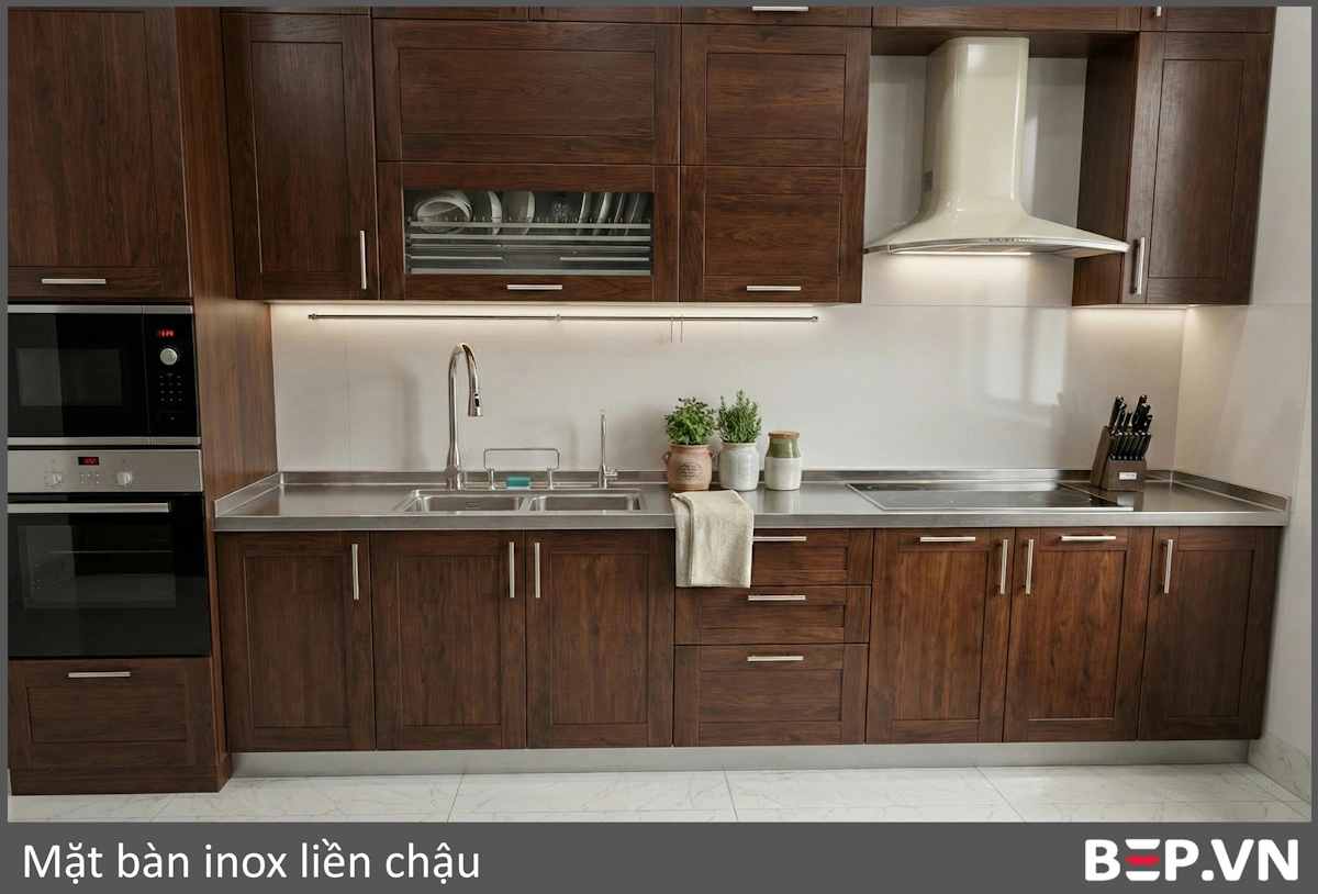 | Tủ Bếp Inox 304 – Cánh Inox Vân Gỗ/Đơn Sắc (Nhập khẩu)(Siêu bền, chống gỉ, thẩm mỹ) | 16.000.000 – 21.000.000+ |