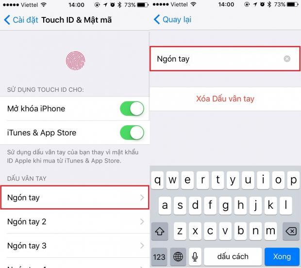 Sau khi nhập mật mã mở máy, chạm ngón tay muốn xóa dấu vân tay vào phím Home, ngay lập tức nhãn ngón tay mặc định cho vân tay ngón đó sẽ bị chuyển thành màu xám.