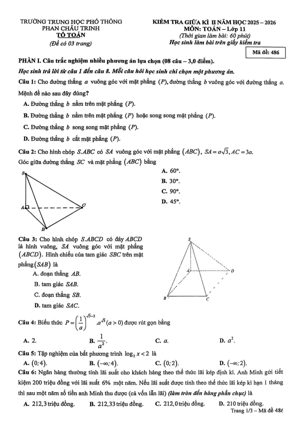Đề giữa kì 2 Toán 11 năm 2025 – 2026 trường THPT Phan Châu Trinh – Đà Nẵng 17/03/2026