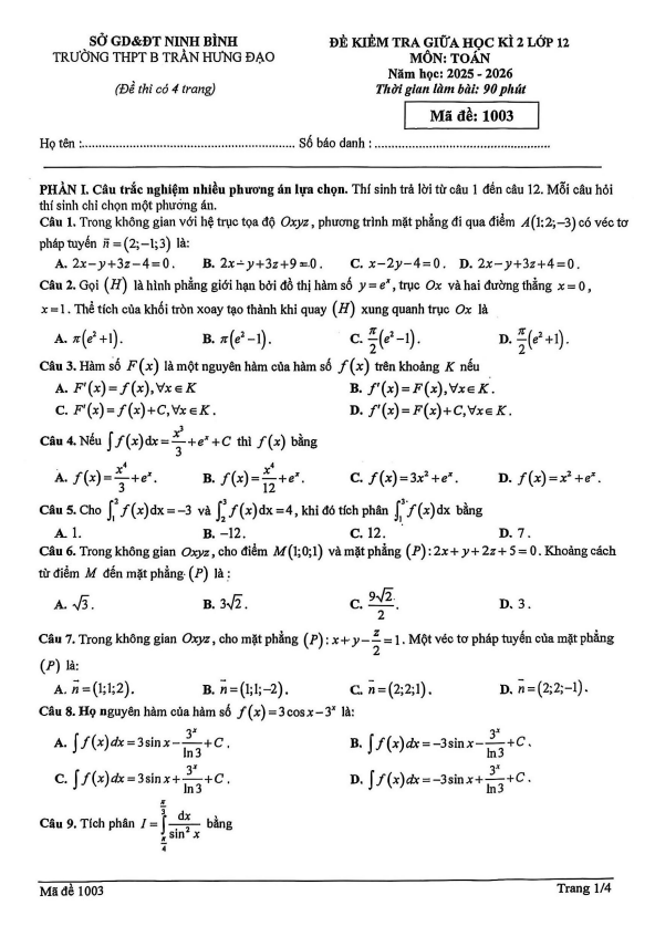Đề giữa kì 2 Toán 12 năm 2025 – 2026 trường THPT B Trần Hưng Đạo – Ninh Bình 17/03/2026