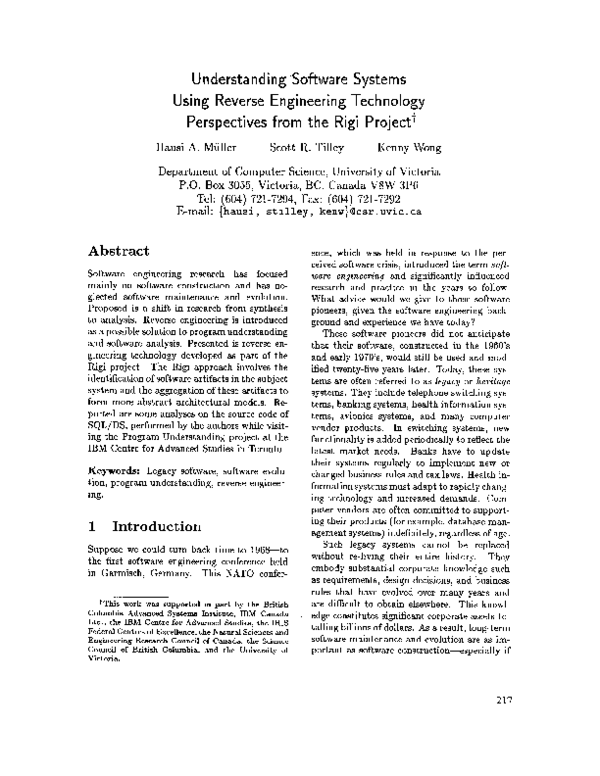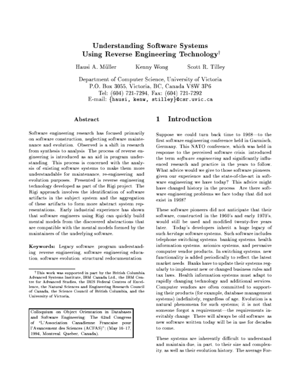 Aho, A. V., Hopcroft, J. E. and Ullman, J. D. 1974 The Design and Analysis of Computer Algorithms, Addison-Wesley, 1974.ANSI IEEE 1983 `IEEE Standard Glossary of Software Engineering Terminology', ANSI IEEE Standard 729 1983.Arnold, R. S. 1990 `Tutorial on Software Reengineering', Conference on Software Maintenance| 1990, San Diego, California, November 26 29, IEEE Computer Society Press Order number 2091.Belady, L. A. and Evangelisti, C. J. 1982 `System partitioning and its measure', Journal of Systems and Software, 21, pp. 23-29.Brandes, T. and Lewerentz, K. 1985 `GRAS: A non-standard database system within a software development e n vironment', Proceedings of the Workshop on Software Engi- neering Environments for Programming-in-the-large Harwichport, Mass., June 9 12, GTE Laboratories Inc., pp. 113-121.Breuer, P. T. and Lano, K. 1991 `Creating speci cations from code: reverse engineering techniques', Journal of Software Maintenance: Research and Practice, 33, pp. 145- 162.Chikofsky, E. J. and Cross II, J. H. 1990 `Reverse engineering and design recovery: a tax- onomy', IEEE Software 71, pp. 13 17.Choi, A. C. and Scacchi, W. 1990 `Extracting and restructuring the design of large soft- ware systems', IEEE Software, 71, pp. 66-71.Choi, A. C. and Scacchi, W. 1991 `SOFTMAN: environment for forward and reverse CASE', Information and Software T e chnology, 339, pp. 664-674.Corrie, B. 1990 A Workbench for Realistic Image Synthesis, M.Sc. Thesis, Department o f Computer Science, University of Victoria.Dunn, D. and Everitt, B. S. 1982 An Introduction to Mathematical Taxonomy, Cambridge University Press.Fletton, N. T. and Munro, M. 1988 `Redocumenting software systems using hypertext tech- nology', Proceedings of Conference on Software Maintenance 1988, Phoenix, Arizona, October 24-27, IEEE Computer Society Press Order Number 879, pp. 54-59.Forte, G. 1992 `Reverse engineering tools', CASE OUTLOOK, March-April, pp. 5-28.Garg, P. K. and Scacchi, W. 1990 `A hypertext system to manage software life-cycle doc- uments', IEEE Software, 73, pp. 90-98.Hutchins, D. H. and Basili, V. R. 1985 `System structure analysis: clustering with data bindings', IEEE Transactions on Software Engineering, SE-118, pp. 749-757.Kaiser, G. E. and Perry, D. E. 1987 `Workspaces and experimental databases: automated support for software maintenance and evolution', Proceedings of Conference on Soft- ware Maintenance 1987, Austin, Texas, September 21-24, IEEE Computer Society Press Order Number 800, pp. 108-114.Maarek, Y. S. and Kaiser, G. E. 1988 `Change management for very large software sys- tems', Proceedings of Phoenix Conference on Computers and Communications Scotts- dale, Arizona, March 16-18, pp. 280-285.Mata-Montero, M. 1990 Algorithms for Treewidth-Bounded G r aphs, Ph.D. Dissertation, Department of Computer Science, University of Victoria, Victoria, B.C.M uller, H. A. 1990 `Verifying software quality criteria using an interactive graph editor', Proceedings of the Eighth Annual Paci c Northwest Software Quality Conference Port- land, Oregon, October 29-31, pp. 228 241.M uller, H. A. and Klashinsky, K. 1988 `Rigi|A system for programming-in-the-large', Pro- ceedings of the 10th International Conference on Software Engineering ICSE Ra es City, Singapore, April 11-15, IEEE Computer Society Press Order Number 849, pp. 80-86.M uller, H. A., M ohr, J. R. and McDaniel, J. G. 1990 `Applying software re-engineering tech- niques to health information systems', Proceedings of the IMIA Working Conference on Software Engineering in Medical Informatics SEMI Amsterdam, October 8-10, 1990, Editor, T. Timmers and B. I. Blum, Elsevier Science Publishers, pp. 91 110.M uller, H. A., Tilley, S. R., Orgun, M. A., Corrie, B. D., and Madhavji, N. H. 1992 `A re- verse engineering environment based on spatial and visual software interconnection models', SIGSOFT'92: Proceedings of the Fifth ACM SIGSOFT Symposium on Soft- ware Development Environments Tyson's Corner, Virginia, December 9-11, ACM Software Engineering Notes, 175, pp. 88-98.M uller, H. A. and Uhl, J. S. 1990 `Composing subsystem structures using k;2-partite graphs', Proceedings of Conference on Software Maintenance 1990 San Diego, California, Novem- ber 26-29, IEEE Computer Society Press Order Number 2091, pp. 12-19.Myers, G. L. 1975 Reliable Software Through Composite Design, P etrocelli Charter, New York.Newbery, F. J. 1989 `Edge concentration: a method for clustering directed graphs', Pro- ceedings of the 2nd International Workshop on Software Con guration Management Princeton, New Jersey, October 24. ACM SIGSOFT Software Engineering Notes, 177, pp. 76-85.Newbery, F. J. and Tichy, W. F. 1990 `EDGE: an extendible graph editor', Software| Practice & Experience, 201, pp. 63-88.Ossher, H. L. 1984 `Grids: a new program structuring mechanism based on layered graphs', Proceedings of the Eleventh Annual Symposium on Principles of Programming Lan- guages Salt Lake City, Utah. January 15-18, ACM Order Number 549840, pp. 11-22.Perry, D. E. 1987 `Software interconnection models', Proceedings of the 9th International Conference on Software Engineering Monterey, CA, March 30 -April 2, IEEE Com- puter Society Press Order Number 767, pp. 61-69.Perry, D. E. and Kaiser, G. E. 1987 `Infuse: a tool for automatically managing and coor- dinating source changes in large systems', Proceedings of the ACM Fifteenth Annual Computer Science Conference St. Louis, Missouri, ACM Order Number 404870, pp. 292-299.Prieto-Diaz, R. and Neighbors, J. M. 1986 `Module interconnection languages', Journal of Systems and Software, 61986, pp. 307 334.Schwanke, R. W. and Plato , M. A. 1989 `Cross references are features', Proceedings of the 2nd International Workshop on Software Con guration Management Princeton, New Jersey, October 24. ACM SIGSOFT Software Engineering Notes, 177, pp. 86-95.Schwanke, R.W. 1991 `An intelligent tool for re-engineering software modularity', Proceed- ings of the 13th International Conferenc
