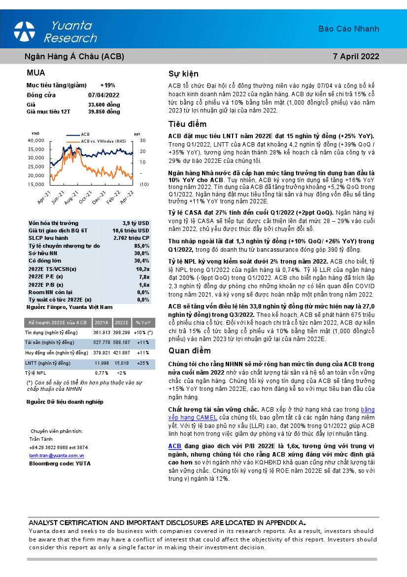 Nguồn: YSVNLoại báo cáo: Phân tích Doanh nghiệpNgày phát hành: 07/04/2022Số lần tải về: 600 Tải về Chúng tôi cho rằng ACB xứng đáng với mức định giá cao hơn so với ngành nhờ vào KQHĐKD khả quan cũng như chất lượng tài sản vững chắc. Chúng tôi kỳ vọng tỷ lệ ROE năm 2022E sẽ đạt 23%, so với trung vị ngành là 12%.Báo cáo mới nhất