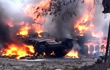 | Xe tăng Georgia bị tiêu diệt tại cửa ngõ Tskhinvali. Ảnh: AFP |