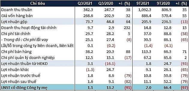 Khấu trừ, Công ty có lãi thuần từ hoạt động kinh doanh trở lại với hơn 3 tỷ đồng, cùng kỳ lỗ hơn 16 tỷ đồng. Dù vậy, do phải ghi nhận chi phí khác đột biến (hơn 49 tỷ đồng nhưng không có thuyết minh), lợi nhuận ròng theo đó thu về chỉ vào khoảng 1,1 tỷ đồng - giảm hơn 92% so với quý III/2020.