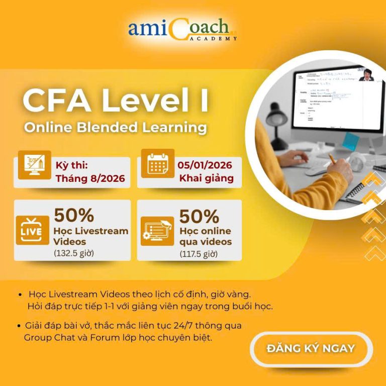 Khai giảng: 05/01/2026. Lịch học xem TẠI ĐÂY Kỳ thi mục tiêu: Tháng 8/2026 Mô hình Online Blended Learning tại amiCoach chính là lựa chọn phù hợp nhất cho bạn. 50% học livestream videos 50% học online videos Tại sao nên chọn học CFA tại amiCoach? ĐĂNG KÝ NGAY để giữ chỗ và bắt đầu lộ trình chinh phục…
