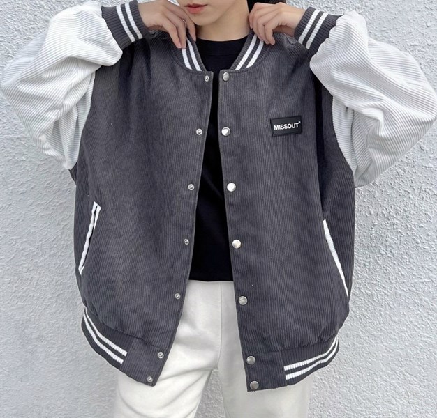 - Áo khoác bomber Missout nhung gân xám tay trắng
