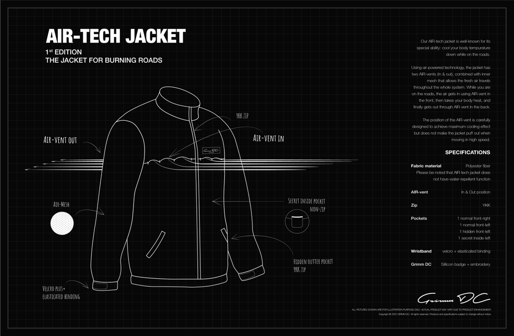 - Công nghệ áp dụng: AIR-tech™ by Grimm DC a.k.a Hệ thống luân chuyển dòng khí. Gồm 3 bộ phận: AIR-vent in a.k.a. khe đưa gió vào, lưới mesh cho phép không khí luân chuyển trước/sau và AIR-vent out a.k.a. khe thoát gió ra. Vị trí AIR-vent in và out được tính toán chi tiết để đảm bảo tối đa hiệu quả thông khí cho các vùng nhiệt độ cao của cơ thể nhưng không làm form áo bị phồng lên quá mức khi di chuyển với tốc độ lớn.