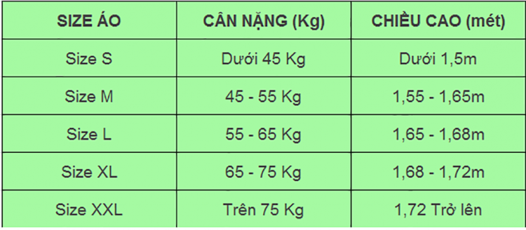 HƯỚNG DẪN CHỌN SIZE ÁO