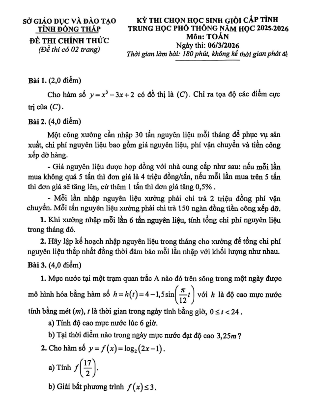 Đề chọn học sinh giỏi tỉnh Toán THPT năm 2025 – 2026 sở GD&ĐT Đồng Tháp 10/03/2026