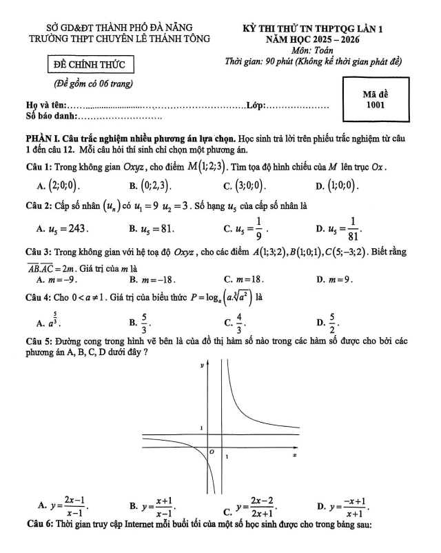 Đề thi thử TN THPT 2026 lần 1 môn Toán trường chuyên Lê Thánh Tông – Đà Nẵng 24/01/2026