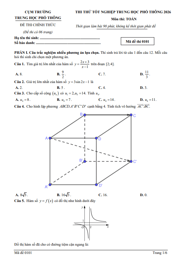 Đề khảo sát lần 1 Toán 12 năm 2025 – 2026 trường THPT Nguyễn Gia Thiều – Hà Nội 23/01/2026