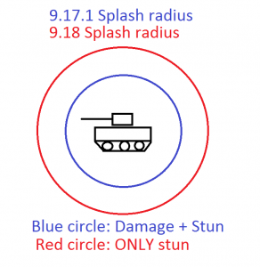 As of Patch 9.18, artillery in World of Tanks has a new mechanic which enables it to stun the crew of an enemy tank. The increased explosion radius is the radius in which a tank will be stunned if an artillery shell lands within that radius. The explosion radius within which a shell will do damage is still the same as it was in 9.17.1 – the extra radius is stun damage only, as this diagram from the forums illustrates: