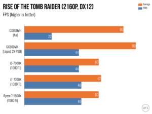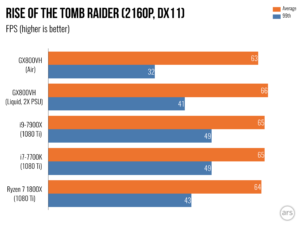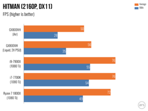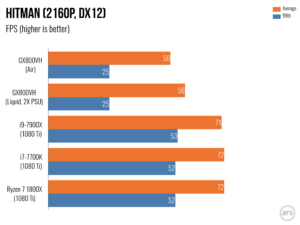 Performance is, as you’d expect for a computer packing an i7 and two GTX 1080’s, impressive. Compared to a GTX 1080 Ti paired with a mighty eight-core Intel processor, the GX800VH often comes in faster at its native display resolution of 4K. That said, SLI support remains something of an oddity. In Hitman, for example, the GX800VH came nowhere near the frame rate of a the lone GTX 1080 Ti. That’s not to mention that, across the board, 99th percentile minimum frame times are poor due to increased frame variance caused by rendering across two GPUs. I didn’t find it all that noticeable during gameplay, but some are more sensitive to this than others.
