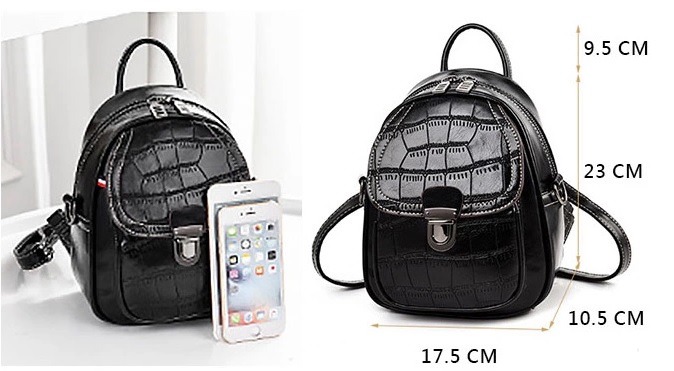 - Chất liệu: Giả da cá sấu- Kích thước: Cao: 23cm; Dài: 17.5cm; Rộng: 10.5cm- Ba lô có thiết kế cá tính mạnh mẽ- Ba lô có thể chuyển thành túi đeo vai với dây đeo tháo rời được.- Tất cả dây đeo đều có thể tháo rời được- Có lỗ ra dây tai nghe trên ba lô- Đường may chắc chắn- Bên trong túi có chia nhiều ngăn nhỏ