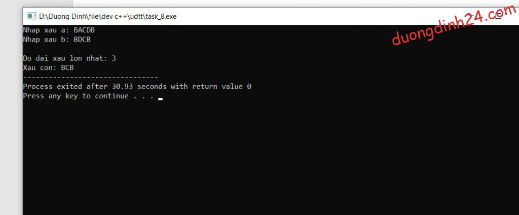 /* COde by https://duongdinh24.com/ Github: https://github.com/duongdinh24/ */ #include<iostream> #include<string> // Thư viện xử lý xâu using namespace std; void longest_Common(string a, string b){ // Hàm tìm xâu con lớn nhất và in ra màn hình int n = a.size(); // n chiều dài xâu a, m chiều dài xâu b int m = b.size(); int max_Size; // Biến lưu độ dài con chung lớn nhất string subsequence = ""; // Biến lưu con chung dùng khi truy vết int L[n+1][m+1]; // Khai báo mảng lưu kết quả: n+1 hàng, m+1 cột for(int i=0; i<=n; i++) // Gán cột đầu tiên bằng 0 L[i][0] = 0; for(int j=0; j<=m; j++) // Gán hàng đầu tiên = 0 L[0][j] = 0; for(int i = 1; i<=n; i++){ for(int j = 1; j<=m; j++){ if(a[i-1] == b[j-1]){ // Nếu có phần tử bằng nhau L[i][j] = L[i-1][j-1] + 1; // Áp dụng công thức } else{ // Trường hợp a[i-1] khác b[j-1] if(L[i-1][j] >= L[i][j-1]) // Tìm max giữa L[i-1][j] và L[i][j-1] L[i][j] = L[i-1][j]; else L[i][j] = L[i][j-1]; } } } max_Size = L[n][m]; // Tìm được độ dài con lớn nhất int i = n; int j = m; while(L[i][j] != 0){ // Điều kiện dừng if(a[i-1] == b[j-1]){ // Nếu bằng nhau subsequence += a[i-1]; // Cộng a[i-1] vào xâu con i--; j--; } else{ // Nếu khác nhau if(L[i-1][j] >= L[i][j-1]) // So sánh i--; else j--; } } cout<<"\nDo dai xau lon nhat: "<<max_Size; // In ra độ dài con lớn nhất cout<<"\nXau con: "; for(int t = max_Size-1 ; t>=0; t--) // In ngược từ cuối về đầu để xâu con đúng thứ tự cout<<subsequence[t]; } int main(){ string a, b; cout<<"Nhap xau a: "; cin>>a; cout<<"Nhap xau b: "; cin>>b; longest_Common(a,b); return 0; }Và đây là kết quả chạy chương trình trên: