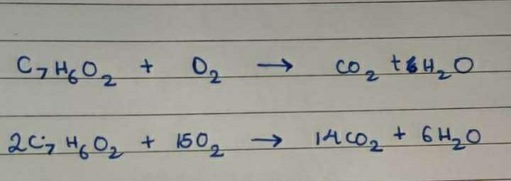 Step 3: Balance the equationTo balance the equation, we need to add coefficients (whole numbers) in front of each molecule until the number of atoms of each element on both sides is equal.C7H6O2 → 7CO2 + 3H2OReactant side:C: 7 atomsH: 6 atomsO: 2 atomsProduct side:C: 7 atomsH: 6 atomsO: 14 atomsNow, the number of atoms of each element is equal on both sides of the equation.