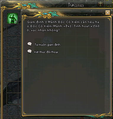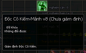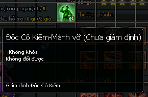 - 1 Độc Cô Kiếm-Mảnh vỡ (chưa giám định)+ 15.600 Tinh Hoạt Lực = 1 Mảnh Độc Cô Kiếm