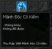 - 1000 Mảnh Độc Cô Kiếm + 10 Yến Tiểu Na (Chưa sửa dụng vào nhân vật) = 1 Độc Cô Kiếm