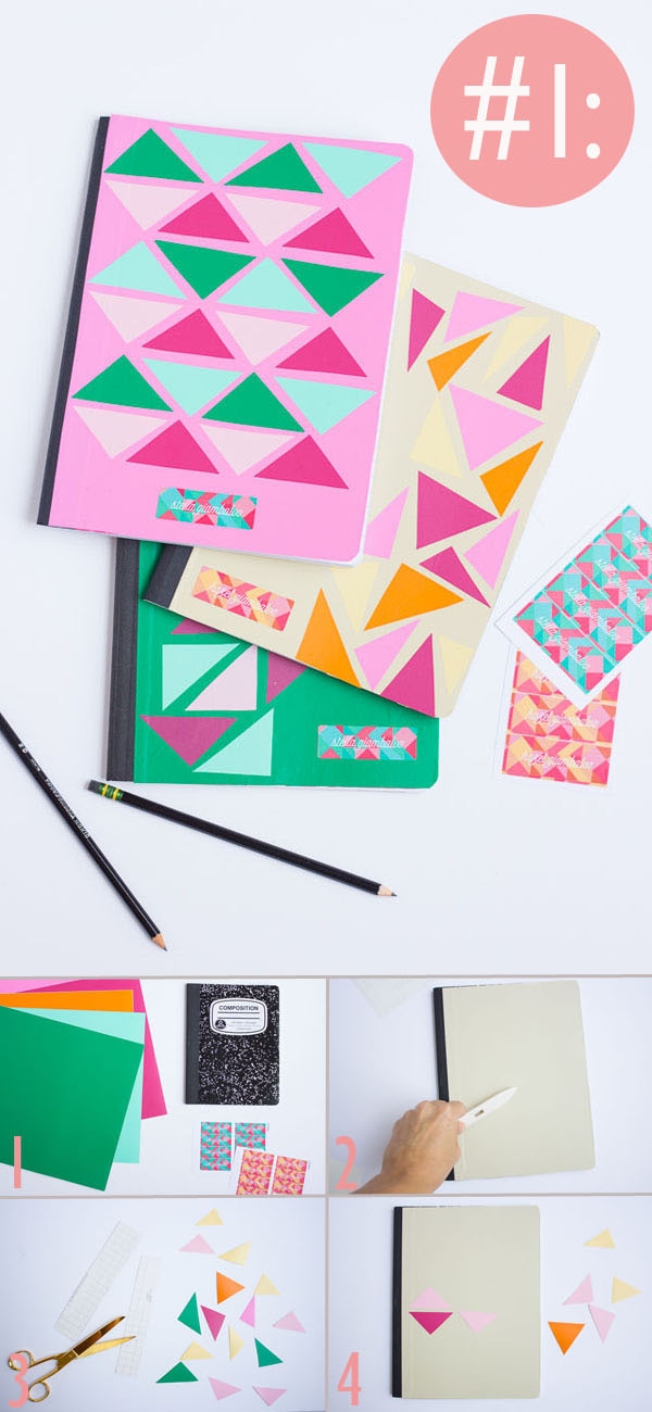 - Sau đó, bạn dán những hình tam giác màu lên trang trí trên mặt bìa cuốn sổ là xong.