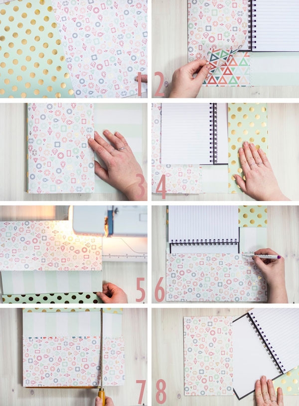 - Sổ tayarrow-up-right hoặc cuốn tập lò xo, giấy bìa giả da hoa văn nhiều màu, kéo, máy khâu, keo dán