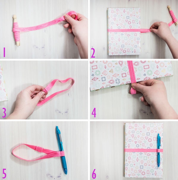 - Bây giờ, chúng mình khâu cố định hai đầu dây thun ôm sát cuốn sổ để giữ sổ rồi khâu phần còn dư để luồn cây bút vào là xong.