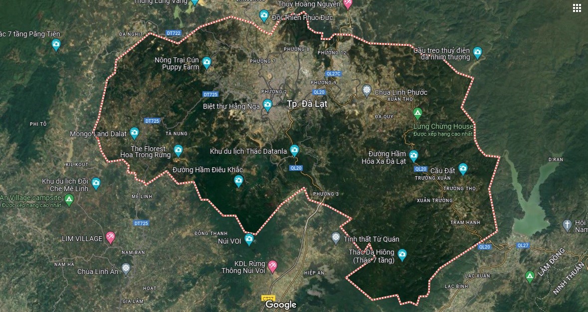 TP Đà Lạt thể hiện trên bản đồ Google vệ tinh.