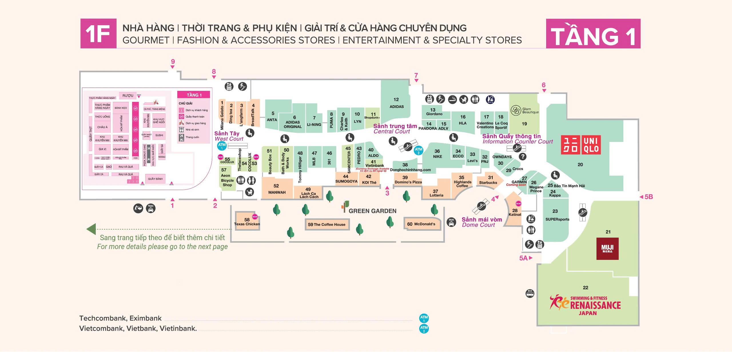 5 ANTA 024 6666 4363 6 ADIDAS ORIGINALS 7 LI-NING 0363974815 8 PUMA 9 Charles & Keith 024 3201 6399 10 LYN 02432000933 12 Adidas 024 6666 7261 13 GIORDANO 024 3200 3291 15 ADLV 16 HLA 024 3200 2931 17 VALENTINO CREATIONS 024 2262 3888 18 Lecoq Sportif 20 UNIQLO 024 3204 5309 23 Supersports 024 6294 0180 24 Kappa 028 3915 1133 – (Exit: 2217) 30 CROCS 024 6294 0191 33 LEVI'S 024 7300 4099 34 ECCO 0914.055.936 36 NIKE 024 7301 1399 40 ALDO 024 3200 2944 42 GIORDANO 024 3200 3291 46 361 47 MLB 024 3201 5889 48 TOMMY HILFIGERĐồ trang sức, mỹ phẩm & phụ kiện