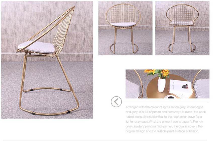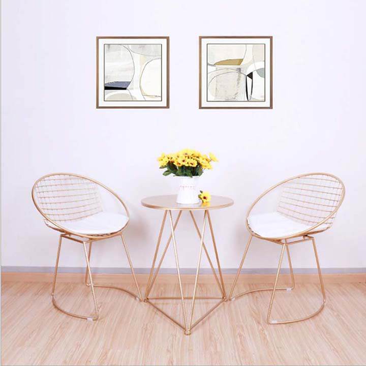 Kết hợp với chiếc bàn tròn xinh xắn là bộ ghế kiểu dáng thư giãn khung tròn phía trên và mặt ngồi bằng sắt đan nhau có nệm mỏng. Chân ghế kiểu dáng hai hình chữ U cách điệu uốn cong tạo ra điểm nhấn độc đáo cho sản phẩm. Với bộ bàn ghế hiện đại, sang trọng này bạn có thể kết hợp với các loại kệ gỗ, kệ sách đẹp đơn giản bằng sắt, bàn ghế sắt cho không gian quán thêm cuốn hút.