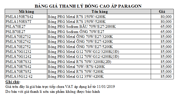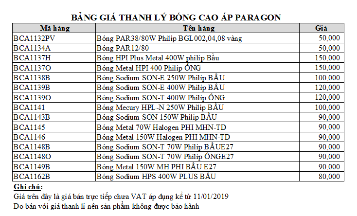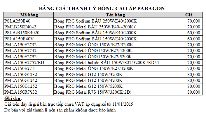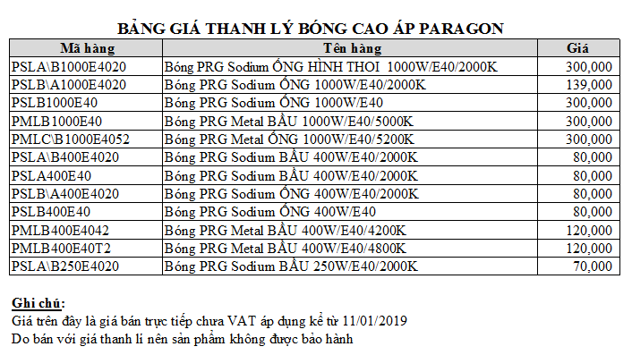 Công ty Minh Hưng Long xin thông báo đến toàn thể Quý khách hàng và hệ thống Đại lí chương trình Thanh lý bóng cao áp thương hiệu Paragon với giá thanh lý cực sốc.