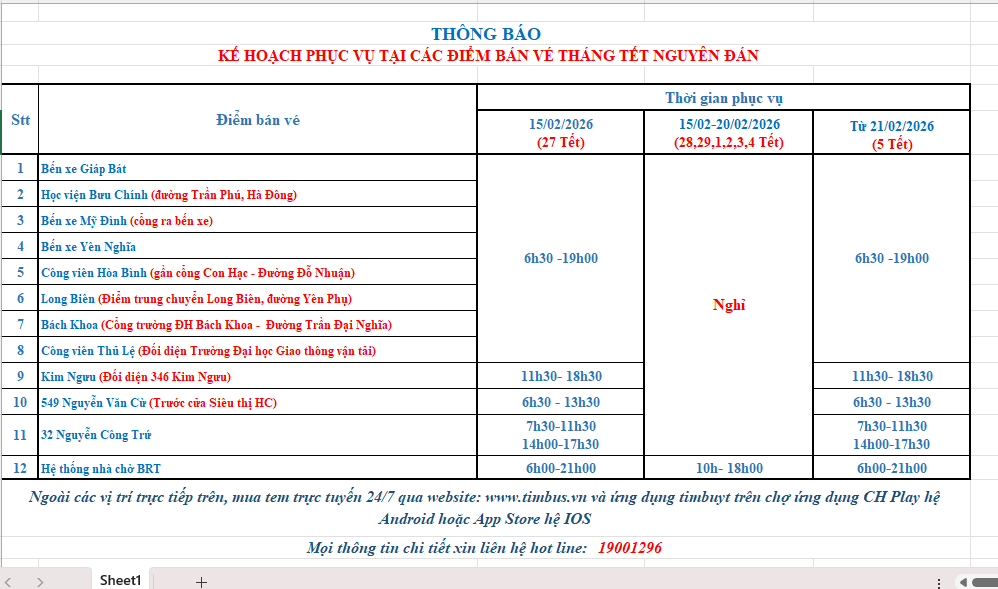 | THÔNG BÁO KẾ HOẠCH THỜI GIAN PHỤC VỤ TẠI CÁC ĐIỂM BÁN VÉ THÁNG TẾT NGUYÊN ĐÁN | |