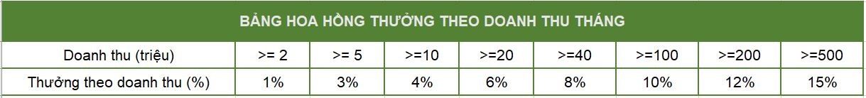 - Thưởng theo doanh thu tháng: Được quy định tại bảng thưởng đính kèm chính sách này.
