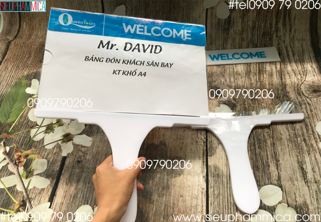 - Bảng đón sân bay hay còn gọi là bảng đón khách, có thể giải quyết được vấn đề của bạn đấy. Bảng đón sân bay, biển đón khách được làm băng chất liệu mica trong suốt, chất liệu mica Đài loan dài 2MM, với tay cầm 20cm được làm từ nhiều lớp mica tạo nên sự bền chắc cho sản phẩm.