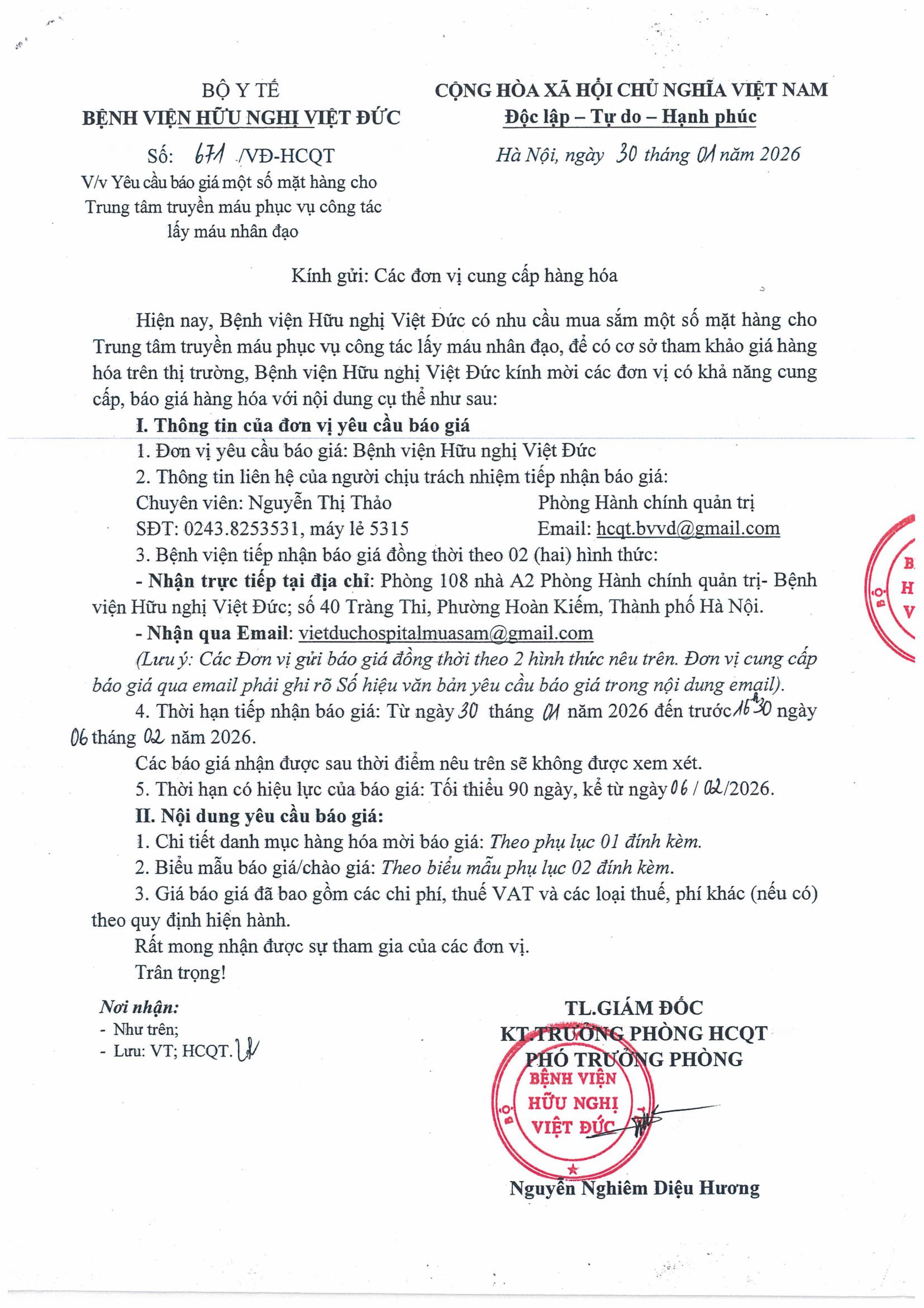 Bệnh viện Hữu nghị Việt Đức có nhu cầu báo giá một số mặt hàng cho Trung tâm truyền máu phục vụ công tác lấy máu nhân đạo