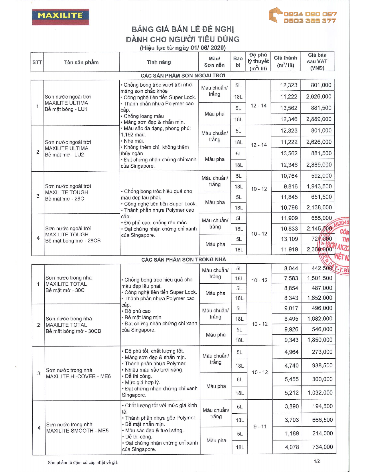 Bảng Giá Sơn Maxilite Mới Nhất 2020 - Paintmart